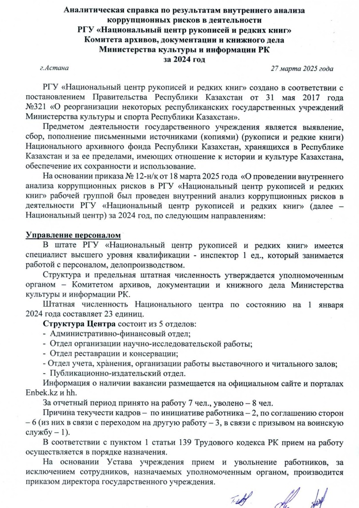 Қазақстан республикасының Мәдениет және ақпарат министрлігі Архив, құжаттама және кітап ісі комитетінің «Қолжазбалар және сирек кітаптар ұлттық орталығы» республикалық мемлекеттік мекемесі өз жұмысын сыбайлас жемқорлыққа қарсы іс-қимыл мәселелері бойынша үздік комплаенс тәжірибелерге сәйкес құрады.