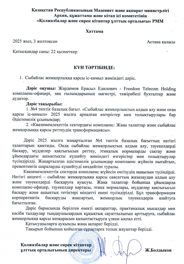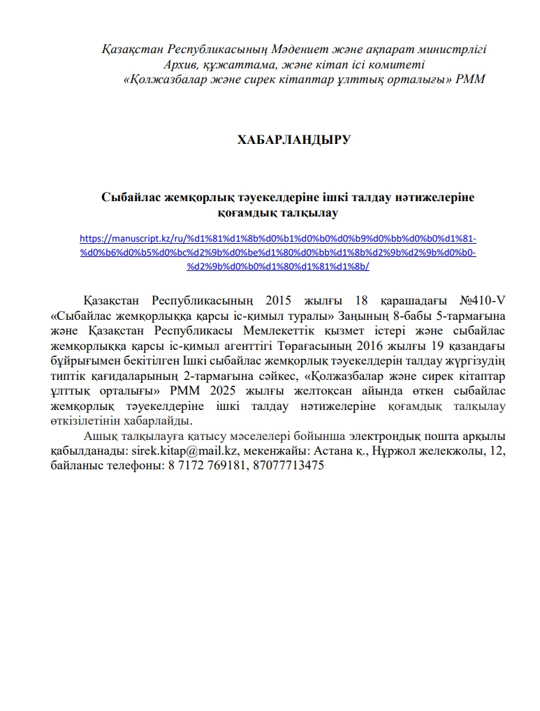 Республиканское государственное учреждение «Национальный центр рукописей и редких книг» Комитета архивов, документации и книжного дела Министерства культуры и информации Республики Казахстан организует свою работу в соответствии с лучшими комплаенс-практиками по вопросам противодействия коррупции.
