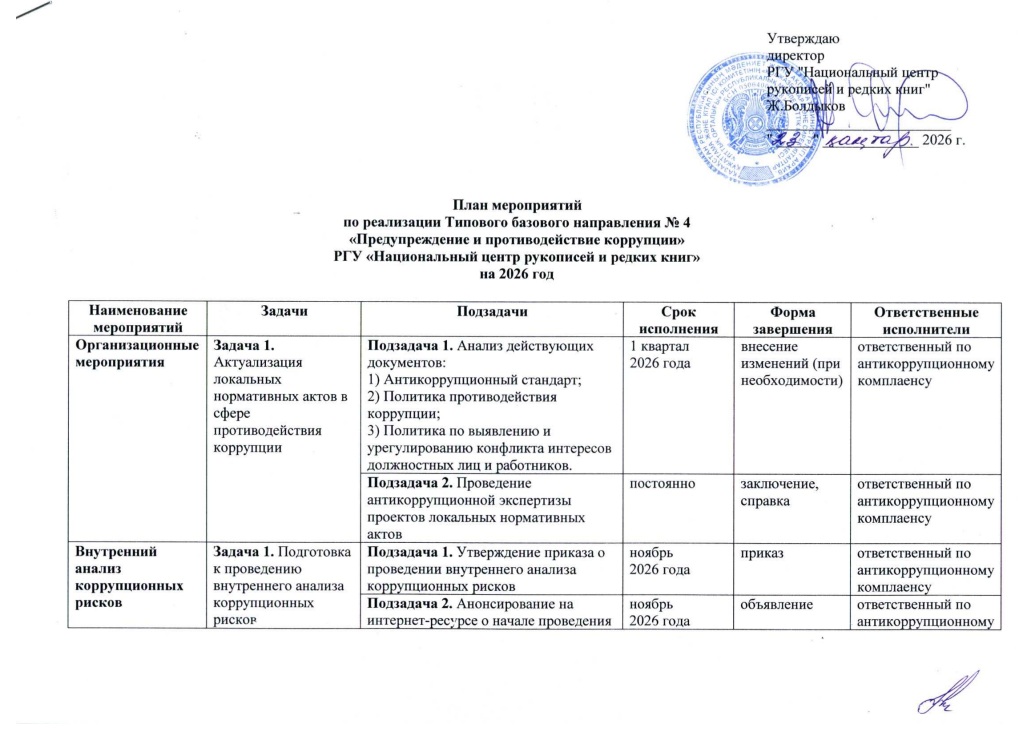 Республиканское государственное учреждение «Национальный центр рукописей и редких книг» Комитета архивов, документации и книжного дела Министерства культуры и информации Республики Казахстан организует свою работу в соответствии с лучшими комплаенс-практиками по вопросам противодействия коррупции.